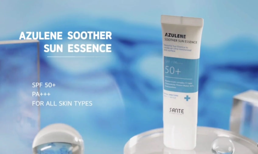 Azulene Soother Sun Essence bases on chamomile flower water and contains 11 types of hyaluronic acids to keep skin hydrated all day while protecting from UV rays.