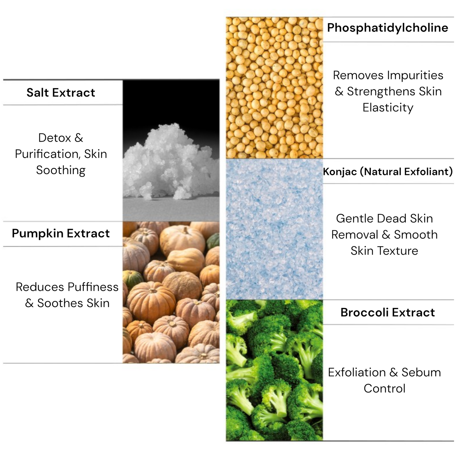 Konjac (natural exfoliant) clears away dead skin cells without irritation