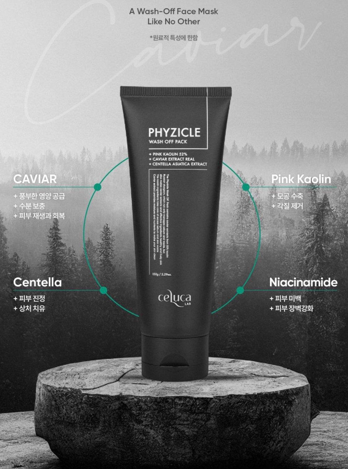 The Phyzicle Wash Off Pack contains the pink kaolin, which helps manage excess sebum and skin impurities, while caviar extract provides moisture and nutrients for clear and healthy skin.